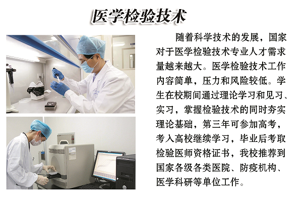 随着科学技术的发展,国家对于医学检验技术专业人才需求量越来越大。医学检验技术工作内容简单,压力和风险较低。学生在校期间通过理论学习和见习、实习,掌握检验技术的同时夯实理论基础,第三年可参加高考,考入高校继续学习,毕业后考取检验医师资格证书,我校推荐到国家各级各类医院、防疫机构、医学科研等单位工作。